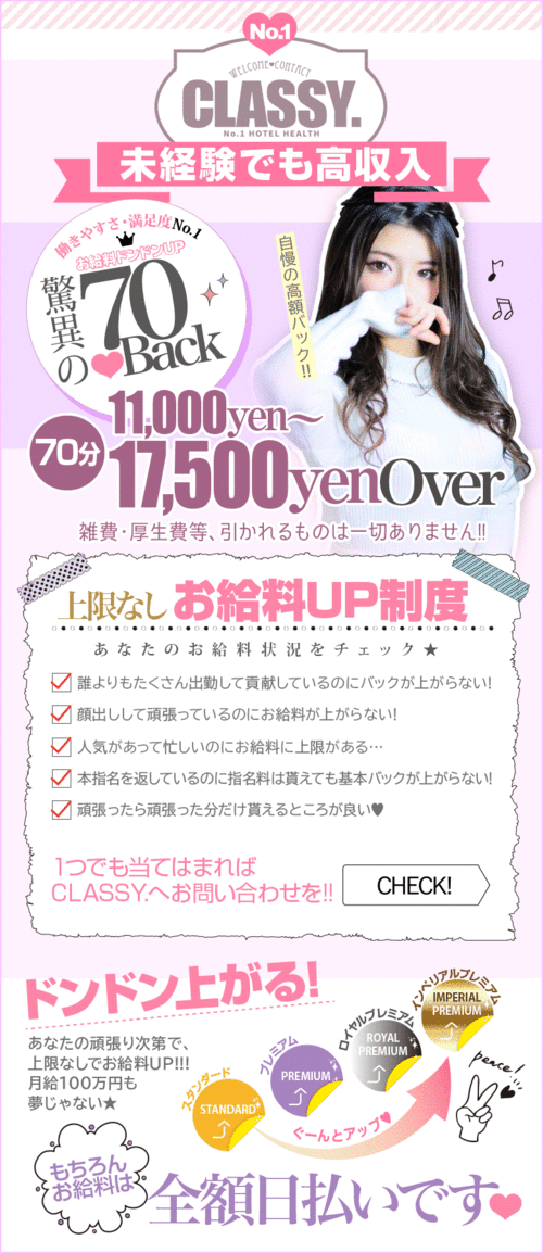 メッセージ:名古屋で唯一のホテルヘルスを立ち上げ長年に渡り沢山の会員様にご愛顧頂き支えられ、ホテルヘルスブランドの地位を確立したと自負しております。未経験の素人っぽさや女の子らしさを大切にした、初めて風俗で働く女の子も働きやすいお店造りを心掛けております。不安を安心に変える「CLASSY.」と言うブランド。